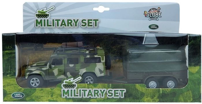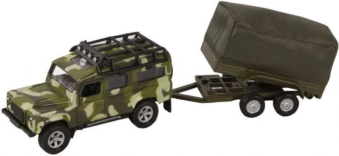 Ga op avontuur met de Auto Landrover “Military Defender” Met Aanhanger Deze “Military Defender” van Kids Globe is een Landrover met legerkleuren, zodat hij niet opvalt. Ook de aanhanger heeft een groene schutkleur. Rijd dus nu onopvallend door de bossen voor je militaire missie! Je kan de aanhanger ook kantelen, om spullen snel te dumpen.Trek de auto naar achteren en als je hem dan loslaat rijdt hij uit zichzelf! Inhoud: Auto Aanhanger De Auto Landrover “Military Defender” Met Aanhanger is geschikt voor militairen vanaf vijf jaar.
