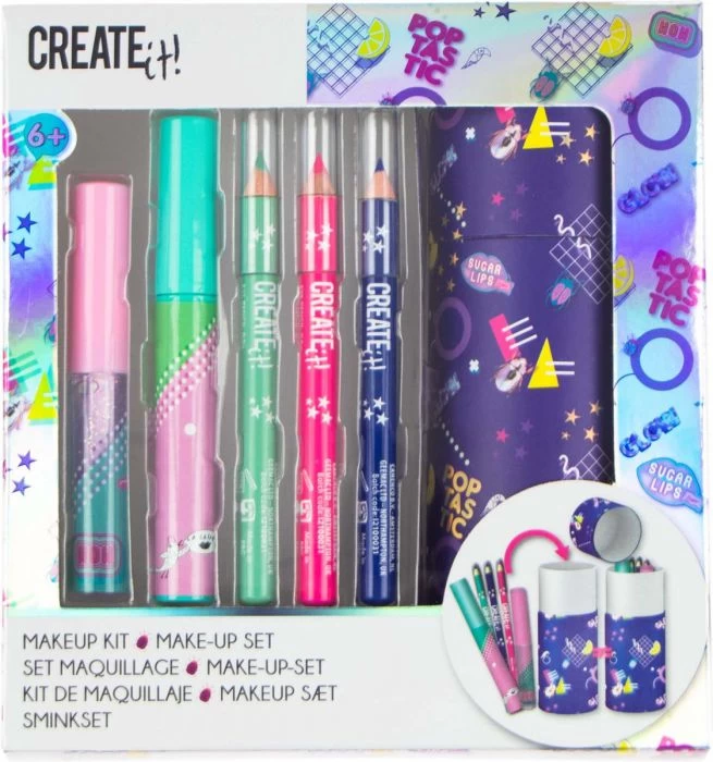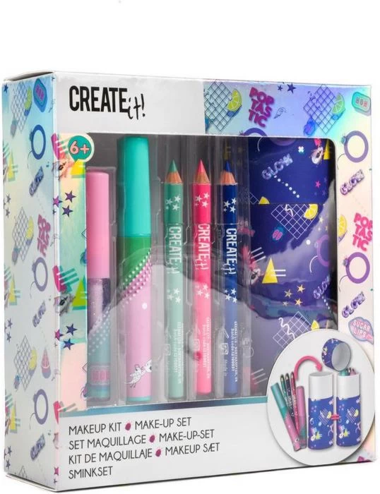 Met deze mooie make-upset van Create It! zullen al jouw vriendinnetjes jaloers op jouw zijn. Gebruik de oogpotloden, mascara en lipgloss om perfect voor de dag te komen! De spulletjes worden geleverd in een handige opbergkoker, zo kun jij de set altijd gemakkelijk overal mee naar toe nemen.
