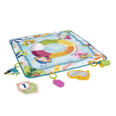 Fisher Price Speelmat. Kenmerken: Grote speelmat voor baby’s met een zwembadthema en speelgoed. Machinewasbare speelmat geeft de illusie dat de baby in een zwembad drijft. Inclusief 4 speelgoed: BPA-vrije ijslolly-bijtring, snorkelspiegel, kreukelspeelgoed met haaien en limonade-rammelaar. Wordt geleverd met 12 maandelijkse mijlpaalkaarten om het eerste jaar van de baby te documenteren. Tummy-time spelen en omgaan met het speelgoed helpt de kernspieren en hand-oog coördinatie te versterken. Geschikt voor kinderen vanaf geboorte.