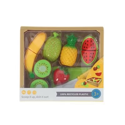 Deze set bestaat uit: snijplank, dunschiller, rasp, mes, ananas, kiwi, aardbei, peer, appel, citroen, banaan, meloen en een braam. Afmeting: 6x4x3 (lxbxh). Geschikt voor kinderen vanaf 3 jaar.