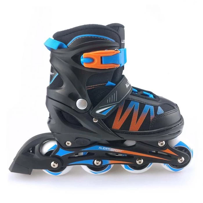 Race ervandoor met de stoere blauw-oranje Alert skeelers maat 39-42 Deze blauw-oranje skeelers van Alert zijn heerlijk om op te skaten! Ze skaten fijn door de soft wieltjes van 70×24 mm en ze zijn makkelijk te sluiten. Dankzij de coole zwarte en blauwe kleuren zal je zeker opvallen tijdens het skaten! Ook kan je de skates heel lang gebruiken, want ze zijn verstelbaar in vier maten. Dus waar wacht je op? Trek je skeelers aan en race ervandoor! De Alert inline skates maat 39-42 zijn geschikt voor kinderen vanaf zes jaar.