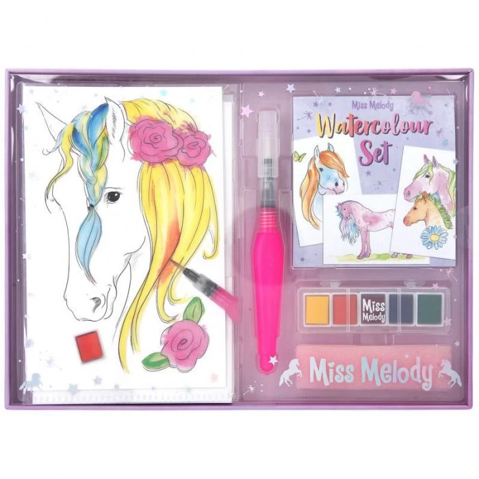 Aquarelleren is leuk met Miss Melody! De creatieve set bevat 20 vellen aquarelpapier met paardenafbeeldingen, een kwast-stift (kan gevuld worden met water), een spons en 5 waterkleuren (geel, rood, paars, blauw, groen). Met eenvoudig te lezen handleiding voor leuk verfplezier.