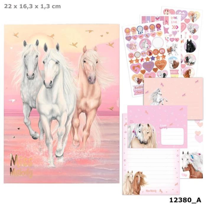 Zachte kleuren, een zonsondergang en drie paarden: het briefpapier van Miss Melody is onbeschreven al prachtig, maar met een persoonlijke tekst echt een highlight. Tevens in de stevige map: 24 vellen briefpapier, 12 enveloppen en 3 stickervellen.