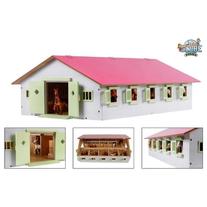 Verzorg je paarden en geef ze een eigen stal met deze paardenstal van Kids Globe. Het dak kan er af zodat je makkelijk met je paarden kunt spelen in de stal. De boxen kunnen ook open en dicht en je kunt je paarden ook een frisse neus laten halen: de ramen kun je opzij schuiven. Zelfs de deuren van de stal kun je open en dicht doen. De stal heeft 9 boxen. Exclusief paarden.