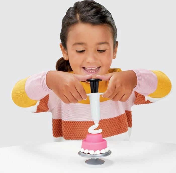 De set bevat ook een mengkom om 3 verschillende Play-Doh-strooisels te maken. Voor nog meer creatief speelplezier heeft elke Play-Doh-taart een geheime holte om kleurrijke verrassingen te krijgen wanneer je de taart snijdt!