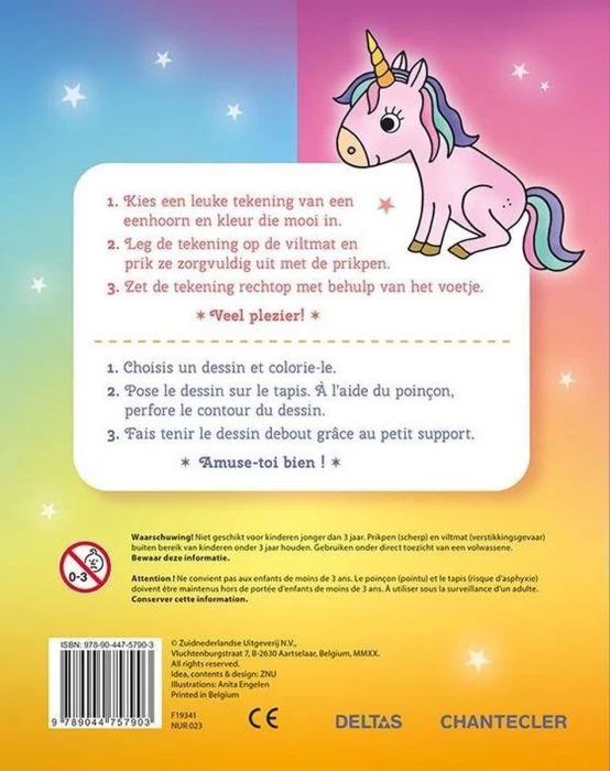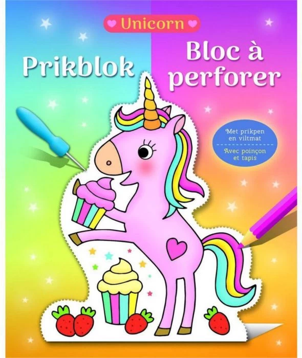 In dit blok vind je leuke tekeningen van coole eenhoorns om uit te prikken. Kies een mooie tekening, kleur ze in en prik ze zorgvuldig uit. Zet je uitgeprikte tekening recht met behulp van het voetje en geniet van je kunstwerkje! Met prikpen en viltmat.