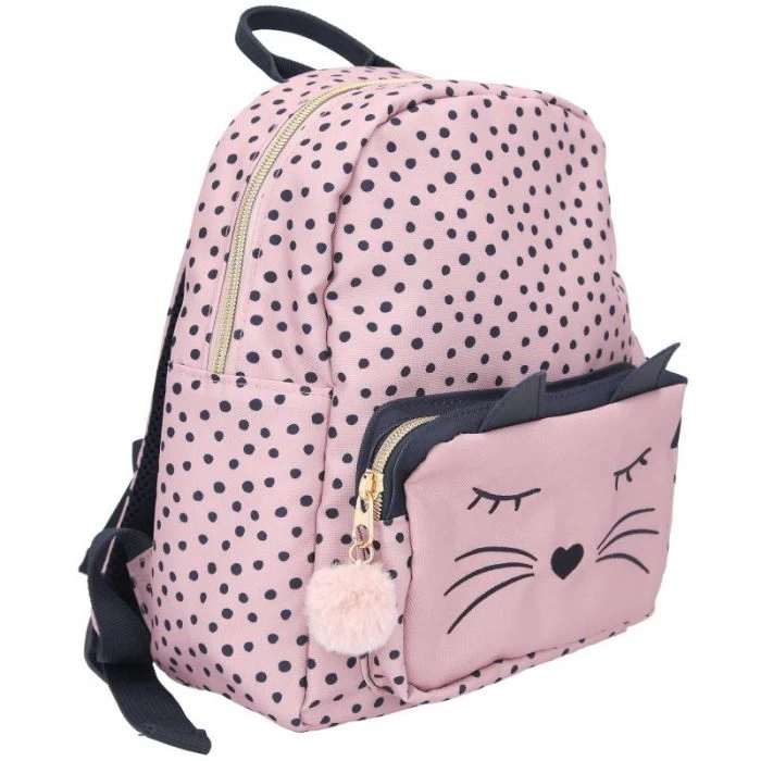 Miauw: de roze rugzak met geborduurd kattengezicht en schattig druppeldesign heeft een hoofdvak en een voorvakje met rits, een extra vakje voor een flesje aan de buitenkant alsmede vakjes binnenin. Ook het draagcomfort maakt indruk: de achterkant en de draagbanden zijn gevoerd en een extra borstriempje voor stabiliteit. Leuk extraatje: een pompon aan de rits. Van Princess Mimi. Materiaal: 100 procent polyester.