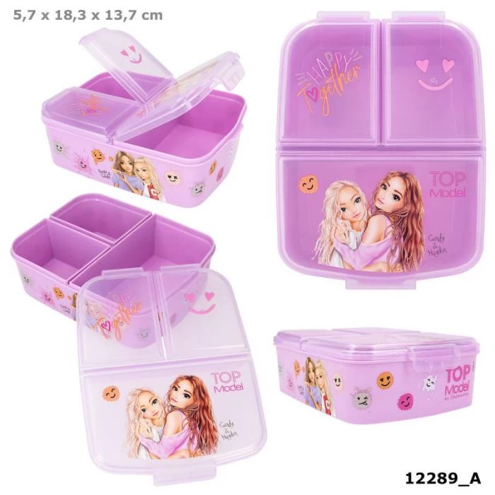 De paarse broodtrommel uit de TOPModel serie Happy Together heeft binnenin 3 aparte vakken (2 kleine en 1 groot vak), mooie afbeeldingen van modellen en heel veel grappige smileys. Vanwege de print niet geschikt voor de vaatwasser en de magnetron. Het materiaal bevat geen bisphenol-A (BPA) of weekmakers (ftalaten). Materiaal: polypropyleen.