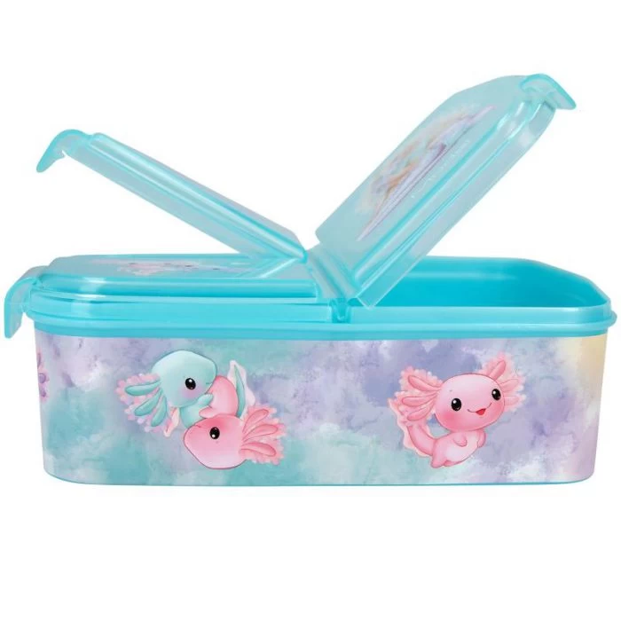 De turquoise TOPModel broodtrommel met een magische zeemeermin en schattige axolotl heeft drie aparte vakken met een kliksluiting (2 kleine vakken, 1 grote). Vanwege de print niet geschikt voor de vaatwasser. Niet te gebruiken in de magnetron. Materiaal: polypropyleen, bevat geen bisphenol-A (BPA) en geen weekmakers (ftalaten).