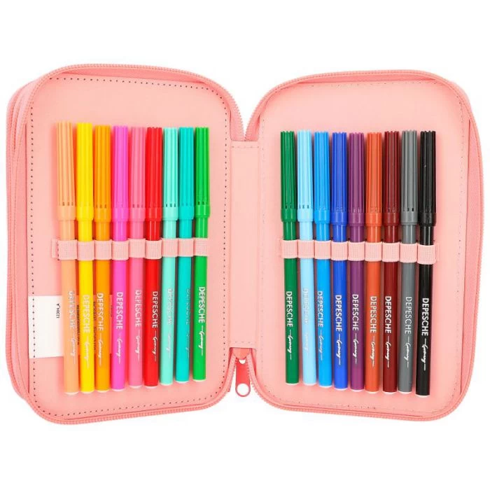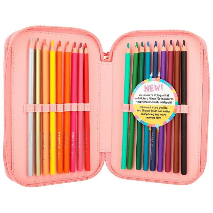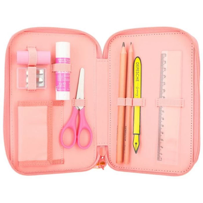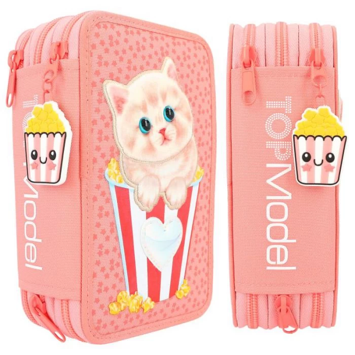 Kitten cool: de 3-vaks etui van TOPModel in trendy peach met kleine roze sterren en schattige applicatie van een kat op de voorkant is compleet gevuld met 18 kleurpotloden, 18 viltstiften, 2 potloden, een liniaal, gum, puntenslijper, schaar, plakstift en een klein vakje met klittenband. Tof extraatje: de popcorn hanger aan de rits. Materiaal: 100 procent PES.