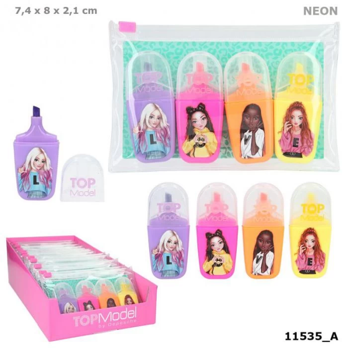 Mini klein en mega cool: 4 kleine markeerstiften van TOPModel in de kleuren paars, neon roze, neon oranje en neon geel. Mooi bedrukt en verpakt in een transparant tasje.