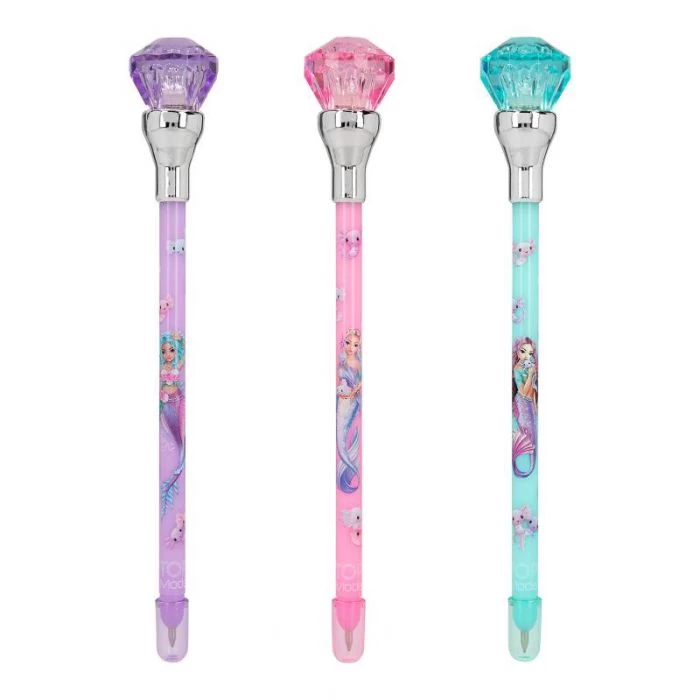 Schattige axolotls en mooie zeemeerminnen: de TOPModel pennen in de kleuren paars, roze en turquoise hebben een diamant als topper die tijdens het schrijven (door het drukken) licht geeft. Batterijen ingesloten (niet vervangbaar), schrijft met blauwe inkt (niet vervangbaar).