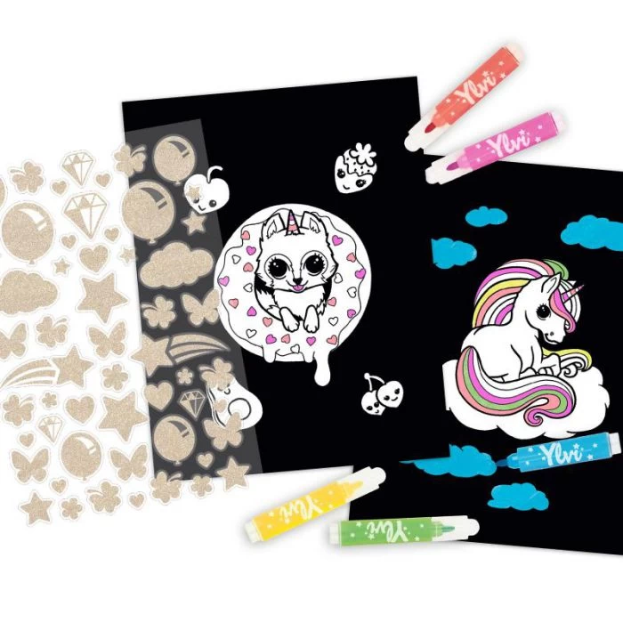 De neon kleurboek set van Ylvi zit vol schattige afbeeldingen en knallende kleuren. 25 pagina’s wachten erop om mooi ingekleurd te worden. Omdat alleen bepaalde vlakken wit zijn, kunnen ook niet geoefende kleine kunstenaars zich in dit boek uitleven. De handzame neon stiften (roze, blauw, oranje, groen, geel) hebben een streepdikte van 1 – 1,5 mm. Tevens ingesloten: 1vel met gouden glitter stickers om alles nog mooier te maken.